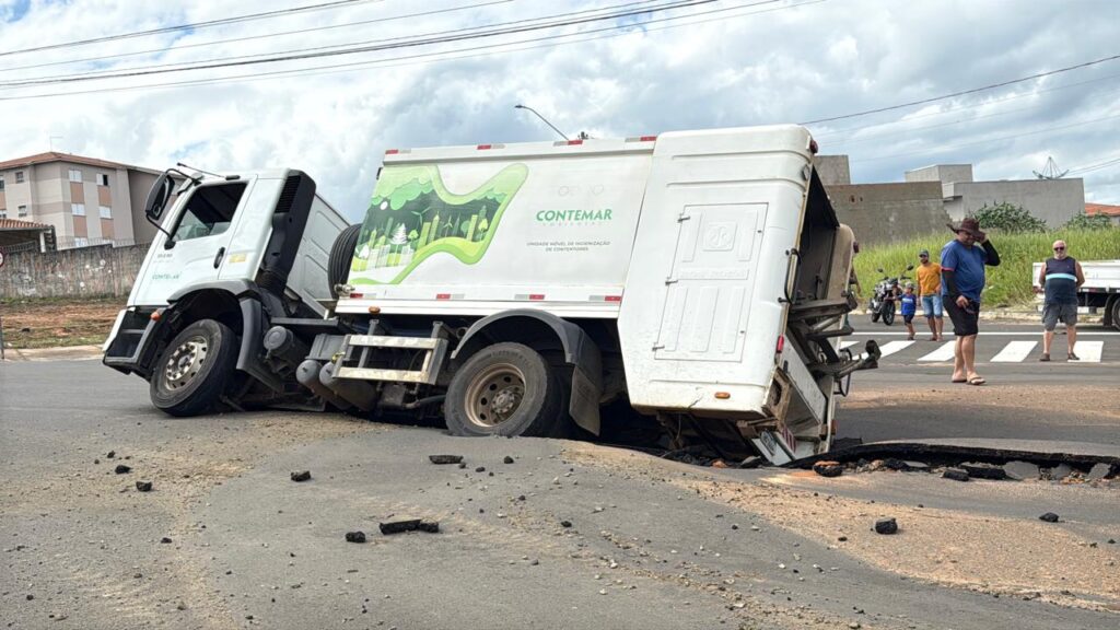 Caminhão de coleta afunda em avenida do Campo Bonito