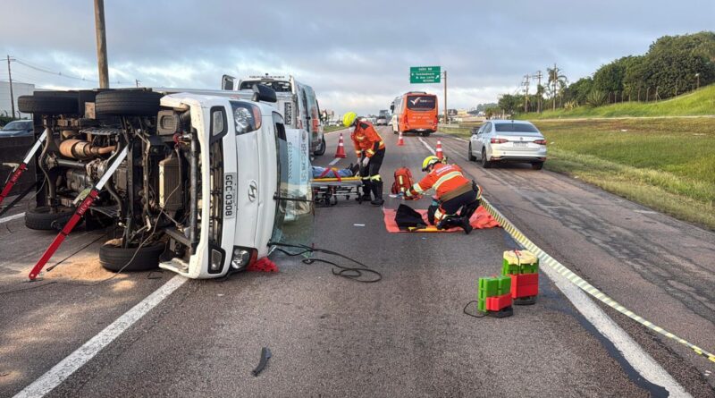 De acordo com as informações apuradas, o condutor perdeu o controle da direção por motivos que ainda serão esclarecidos. O caminhão acabou tombando na pista, mas não houve colisão com outros veículos nem com o guard-rail.