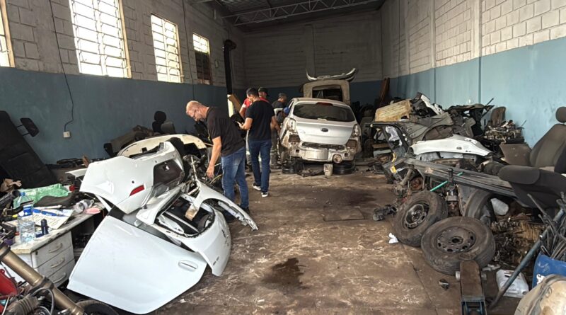 As diligências levaram os agentes até um barracão, onde foram encontrados diversos veículos desmontados, além de grande quantidade de peças automotivas sem comprovação de origem lícita.
