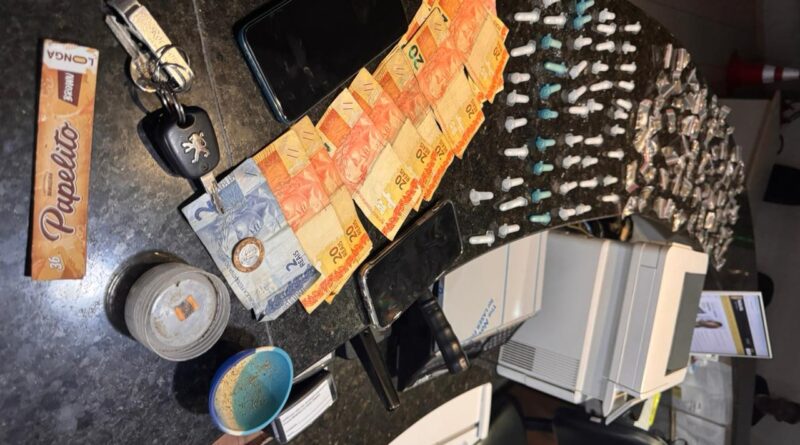 No total, foram apreendidos 53 porções de cocaína, 74 porções de maconha e R$ 303 em dinheiro.